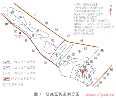 別什旨特坳陷東南部為基薩爾褶皺隆起區(qū),是阿姆河盆地的邊緣造山帶,與阿富汗—塔吉克盆地相接,呈復式背斜和復式向斜的構造格局。隆起區(qū)具有正地貌特征,其山系海拔介于600~l000m,出露古生代基底,隆起區(qū)向盆地內部傾沒部位則與負向地貌一致,地表出露的地層較新。基薩爾隆起區(qū)可以進一步分為3個逆掩斷裂背斜帶,即阿克庫姆拉姆高爾達克構造帶、加拉恰加特構造帶、庫基坦格構造帶。