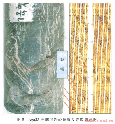 別什肯特坳陷與基薩爾褶皺隆起區(qū)新牛代擠壓作用強,發(fā)育了大量的逆沖斷裂,在上侏羅統(tǒng)卡洛犬階牛津階碳酸鹽巖儲層中形成的大量構造裂縫,如別什肯特坳陷Aga23井的巖心及成像測井表明,靠近斷裂高角度及斜交裂縫發(fā)育,存在北西向和北東向2組小尺度裂縫(圖5)。別什肯特坳陷上侏羅統(tǒng)卡洛夫階—牛津階碳酸鹽巖是深水盆地相[14],儲層巖性較致密,平均孔隙度介于3.5%~3.8%,平均滲透率為0.09mD,儲層物性較差,裂縫的發(fā)育改造了儲層的儲滲性能,增加了滲透性。因此,北西走向的基底斷裂與北東走向的晚期斷裂相交地區(qū),是儲層發(fā)育的有利區(qū)。