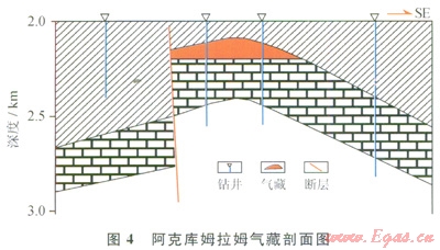 別什肯特坳陷與基薩爾褶皺隆起區(qū)新生代擠壓構造運動強烈,基底古構造破壞大,構造圈閉形成受新生代擠壓構造運動控制,以逆掩斷裂背斜、斷背斜和擠壓背斜等構造圈閉為主,圈閉幅度大。如位于基薩爾褶皺隆起區(qū)阿克庫姆拉姆氣田,為一北東走向的逆沖斷裂擠壓背斜構造氣藏,氣藏西翼被逆沖斷裂切割,碳酸鹽巖與鹽膏巖對接,形成側向遮擋,構成了逆沖斷裂背斜構造氣藏(圖4)。