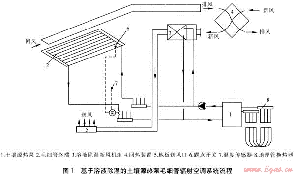 基于溶液除濕的土壤源熱泵毛細管輻射空調(diào)系統(tǒng)發(fā)展很快[1~5],系統(tǒng)流程見圖1。采用溫濕度獨立處理原理控制室內(nèi)熱濕環(huán)境:向室內(nèi)送入經(jīng)溶液除濕新風(fēng)機組處理后的干燥空氣控制濕度和滿足新風(fēng)需求,采用獨立的毛細管輻射空調(diào)系統(tǒng)消除顯熱控制室內(nèi)溫度,從而全面調(diào)節(jié)室內(nèi)熱濕環(huán)境。用土壤源熱泵作為系統(tǒng)的冷源,采用地板送風(fēng)口送入新風(fēng),吸收室內(nèi)余熱余濕的排風(fēng)與新風(fēng)進行全熱交換。毛細管輻射空調(diào)系統(tǒng)由毛細管終端、獨立新風(fēng)系統(tǒng)、控制系統(tǒng)組成: