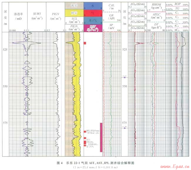 為了提高薄氣層厚度的解釋精度,引進陣列感應(yīng)測井[12](Array Induction Tool,簡稱AIT)、方位電阻率測井[13](Azimuthal Resistivity Imager,簡稱ARI)、綜合孔隙度測井(Integration Porosity Log,簡稱IPL)提高了薄層厚度的解釋精度。如圖4中在519.7~521.4m,氣層段由于侵入影響AO90電阻率值明顯高于常規(guī)感應(yīng)電阻率值6W·m左右;而在580.0~591.0m氣層段為砂泥巖交互層段AO90電阻率曲線明顯顯示了砂泥巖薄互層的特性,薄砂層電阻率明顯高于常規(guī)感應(yīng)電阻率值,而常規(guī)感應(yīng)電阻率曲線只反映了薄互層的平均電阻率值,同時,AST、IPL等曲線也顯示了與之對應(yīng)的砂泥巖薄互層的特性。