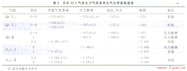 由于含氣砂巖明顯的低速特征,在模糊區(qū)之外氣層的亮點或極性反轉(zhuǎn)等都非常清楚(圖5)。在南區(qū)可以看到氣層的平點特征,而薄層一般可見明顯的極性反轉(zhuǎn)現(xiàn)象。實鉆資料和壓力推算證實,這一地震信息是可以確定各氣藏的含氣范圍的。如Ql1V上氣組的氣水界面,壓力推測為-573m,亮點為-575m,實鉆為-570.8m,基本一致(表2);另外,利用試井分析結(jié)果明確斷層位置,確定合理含氣范圍。如N2y1I氣組6井區(qū)和3、5井區(qū)兩個單元經(jīng)井證實氣水界面和氣體組分均有差異,但由于模糊區(qū)的存在,兩個井區(qū)之間疑似有一條走向近南北的斷層,通過2、6井的試井解釋,均顯示有不滲透邊界的存在,證實了“模糊區(qū)”內(nèi)F4斷層的存在,為合理確定這兩個計算單元的含氣范圍提供了依據(jù)。