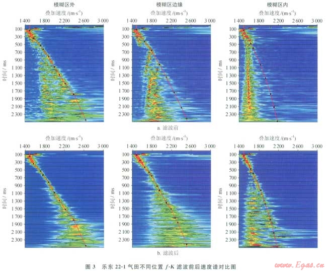 基于上述認識,加強了對全區(qū)的地震速度譜的解釋分析。分析發(fā)現(xiàn)“模糊區(qū)”外速度譜能量團集中,質(zhì)量較好,解釋可靠;進入“模糊區(qū)”后,速度譜質(zhì)量明顯降低,看不到一次波的能量團,特別是中心部位只有多次波的能量團出現(xiàn),無法進行速度解釋(圖3)。分析認為該區(qū)淺層氣十分發(fā)育,淺層氣與其圍巖的波阻抗差別很大,從而形成很強的反射。淺氣層與淺氣層之間、淺氣層與海底之間就產(chǎn)牛了很強的層間多次波,致使在地震速度譜上一次波的能量被掩蓋,譜上顯示出的全是多次波的能量團。因此壓制多次波便成為精細速度分析的首要任務(wù)。經(jīng)過多次試驗,f-K濾波。叫對壓制本區(qū)的多次波效果較好(圖3)。經(jīng)濾波處理后,“模糊區(qū)”外正常地層的速度譜能量團更清楚;剛進入“模糊區(qū)”的速度譜也出現(xiàn)了較集中的一次波的能量團,能夠準(zhǔn)確地進行解釋;“模糊區(qū)”中心的速度譜雖然仍有較強的多次波能量團出現(xiàn),但一次波的能量團已清楚地出現(xiàn)在速度譜上,完全可以進行可靠的速度解釋。