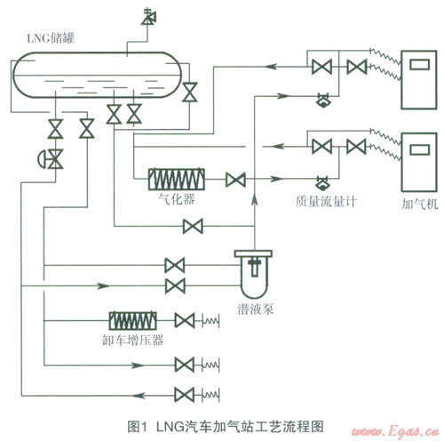 LNC汽車加氣站具有卸車、儲(chǔ)存、增壓、加氣等工藝過(guò)程,南此形成了相應(yīng)的T藝流程,見(jiàn)圖l。