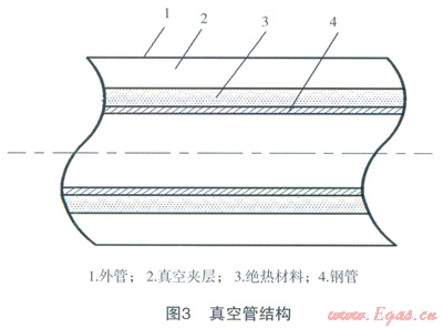 LNG槽車到站后,通常通過(guò)低溫泵法或增壓器法對(duì)槽車內(nèi)LNG增壓后將LNG卸入儲(chǔ)罐內(nèi)。不論采用哪種方法,LNG必須通過(guò)低溫管道進(jìn)行輸送,在輸送過(guò)程中,LNG將吸收外界環(huán)境熱量而氣化,產(chǎn)生BOG。為了減少BOG的產(chǎn)生,通常利用兩種方法對(duì)低溫管道進(jìn)行保冷處理,即絕熱材料包覆法和真空管法,這兩種方法結(jié)構(gòu)如圖2、3所示[5]。