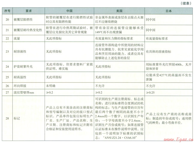 (6)對(duì)耐溶液性我們的標(biāo)準(zhǔn)沒(méi)有明確要求,美國(guó)和日本標(biāo)準(zhǔn)都有要求,我們需要根據(jù)我國(guó)的實(shí)際制定相關(guān)的要求,包括耐紫外光,建議在以后標(biāo)準(zhǔn)修訂時(shí),能夠參考日本的標(biāo)準(zhǔn)制定適合我國(guó)國(guó)情的相關(guān)要求,如耐溶液性除了常用的油鹽醬酷外,包括清潔用的除油劑和洗滌劑,耐紫外光可以直接采用日本標(biāo)準(zhǔn)的相關(guān)部分。因?yàn)橹袊?guó)的塑料原材料生產(chǎn)比較混亂,塑料的成分沒(méi)有統(tǒng)一的標(biāo)準(zhǔn),而且檢測(cè)它的化學(xué)成分難度比較大,尤其足用舊的塑料回用,性能明顯下降,但是很難識(shí)別,原材料廠家的檢測(cè)報(bào)告都是通過(guò)標(biāo)準(zhǔn)樣塊送檢,沒(méi)有可比性,我們應(yīng)盡快制定相關(guān)的技術(shù)指標(biāo)及試驗(yàn)方法,針對(duì)波紋軟管成品進(jìn)行檢測(cè)。
