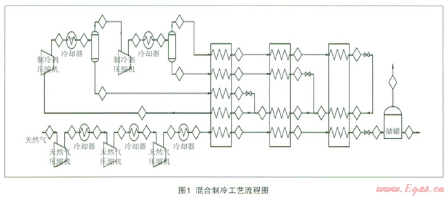 流程簡述:天然氣原料通過壓縮機一級壓縮并和循環(huán)水換熱,然后通過二級壓縮二次和循環(huán)水換熱,再經(jīng)過三級壓縮換熱進入換熱器(LNGl00)和制冷劑一次換熱,再經(jīng)換熱器(LNGl01)二次換熱,最后進入換熱器(LNGl02)換熱流入LNG大罐。另一路為制冷劑閉路循環(huán)從板翅式換熱器LNGl00復(fù)熱回來的制冷混合劑經(jīng)離心壓縮機一級壓縮換熱,流出分兩路,液體進入板翅式換熱器進行節(jié)流換熱。一路混合氣體再次經(jīng)二級壓縮換熱,分兩路氣體和液體氣體一路進入板翅式換熱器,二級壓縮分離出來的液體經(jīng)板翅式換熱器(LNGl00LNGl00、LNGl00)換熱匯總到離心壓縮機進口。