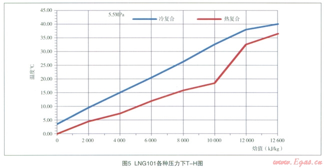 由圖4可以看出當(dāng)系統(tǒng)壓力高于臨界壓力時,煤層氣的等壓冷凝過程不再經(jīng)過兩相區(qū),而且等壓溫度曲線隨著壓力的升高愈加平滑;當(dāng)系統(tǒng)壓力低于臨界壓力時煤層氣的等壓冷凝過程需經(jīng)過兩相區(qū),而且壓力越低在汽液兩相區(qū)停留的區(qū)間就會越大。煤層氣壓力越高,越有利于冷箱中冷熱物流熱交換平衡和物流間的平均溫差。