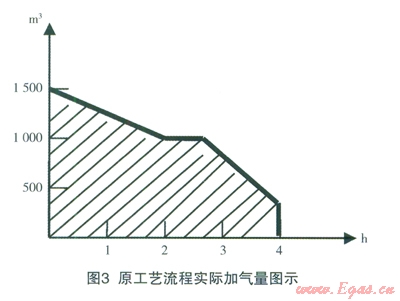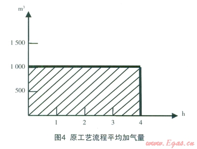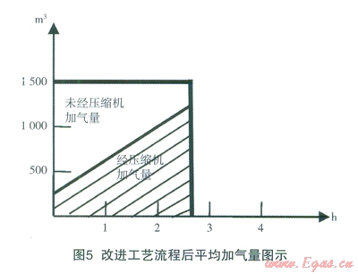 改進(jìn)工藝流程平均加氣量圖示:上部為管束氣瓶直接加入CNG汽車天然氣氣量,下部為經(jīng)壓縮機(jī)壓縮的加氣量;改進(jìn)工藝流程后加氣量由1000m3/h增加到1500m3/h;一輛管束車卸氣時(shí)間由原4h/車縮短到3h/車以內(nèi);改進(jìn)工藝流程后相對(duì)減少了壓縮機(jī)開機(jī)時(shí)間,減少了壓縮機(jī)的磨損并降低了能耗,實(shí)現(xiàn)了壓縮機(jī)在原有排氣量不變情況下提高加氣量的目的。