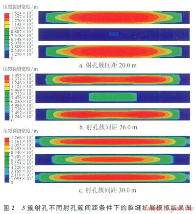 筆者模擬了2簇、3簇和4簇射孔在不同的射孔簇間距條件下的裂縫擴(kuò)展,圖2所示為3簇射孔、不同的射孔簇間距條件下的擴(kuò)展結(jié)果,圖2-a為射孔簇間距為20.0m時(shí)的裂縫擴(kuò)展結(jié)果,中間的射孔簇只能開啟小段距離后就發(fā)生止裂,不能形成有效裂縫;圖2-b所示的為射孔簇間距為26.0m時(shí)的裂縫寬度圖,中間的射孔簇產(chǎn)生的壓裂裂縫能擴(kuò)展一段距離,但是裂縫的艮度有限,不到兩端射孔壓裂裂縫的一半;圖2-c所示的是射孔簇間距為30.0m時(shí)的裂縫擴(kuò)展結(jié)果,中間的裂縫長度只比兩端的裂縫略短,形成了有效裂縫。