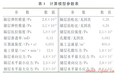 計(jì)算模型的參數(shù)如表1所示,計(jì)算模型主要包括巖石力學(xué)、孔隙度、滲透率、地應(yīng)力、壓裂液黏度、施工排量等參數(shù)。為了研究某些參數(shù)對裂縫干擾的影響,部分參數(shù)可能會發(fā)生改變。