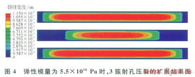 彈性模量增大,所有的壓裂裂縫的寬度有一定的降低,但是裂縫寬度降低有助于減少裂縫間的干擾,能增加中間射孔簇裂縫的裂縫長度。