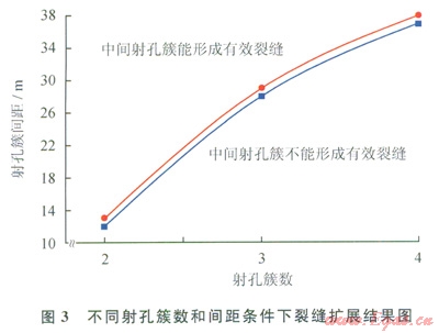 假設(shè)中間射孔簇形成的壓裂裂縫長度達(dá)到兩端裂縫的一半以上,認(rèn)為中間裂縫形成了有效裂縫。不同射孔簇?cái)?shù)、簇間距條件下的裂縫擴(kuò)展情況如圖3所示,從圖3可以看出:射孔簇?cái)?shù)增加,能形成有效裂縫的極限間距增加,且增加幅度較大;射孔簇?cái)?shù)為2簇,極限干擾距離為13.0m;射孔簇?cái)?shù)增加到4簇,極限十?dāng)_距離增加到38.0m。