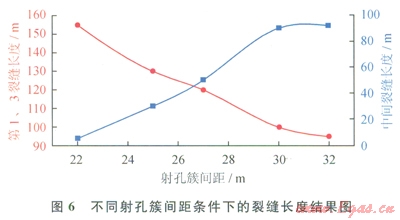 根據(jù)改造儲層的物性參數(shù)以及相鄰水平井的壓裂施工參數(shù),對要優(yōu)化的水平井進(jìn)行了“分段多簇”壓裂裂縫擴(kuò)展模擬,不同射孔簇間距條件下得到的壓裂裂縫長度如圖6所示(考慮對稱性,兩端射孔簇的裂縫在圖中只畫一條曲線):當(dāng)射孔間距為22.0m時(shí),中間射孔簇的壓裂裂縫基本沒有壓開,只形成了很短的壓裂裂縫。當(dāng)射孔簇間距為30.0m時(shí),中間的射孔簇形成的壓裂裂縫和兩端射孔簇形成的壓裂裂縫基本相當(dāng)。因此,壓裂設(shè)計(jì)過程中,射孔簇的間距設(shè)定在30.0m左右比較合適,根據(jù)射孔簇間距參數(shù),每個(gè)壓裂段的長度確定為90.0m,壓裂段數(shù)為ll段。