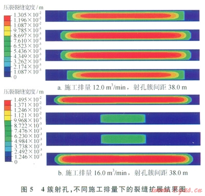 5所示的是4簇射孔、射孔簇間距為38.0m,施工排量分別為l2.0m3rainl6.0m3min時(shí)的裂縫擴(kuò)展情況,施工排量增大4.0m3min,中間裂縫的長度發(fā)生了明顯變化;施工排量為l6.0m3min、4簇射孔條件下,中間射孔簇?zé)o法形成有效裂縫。