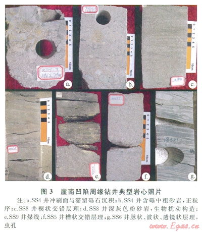 崖城l3-1氣田的其他鉆井具有同樣的沉積特征(圖3-c、3-d、3-e),與SS4井緊鄰的SS5井崖三段也有類似特點(diǎn)(圖3-f)。位于SS5井南部的SS6井崖三段下部為灰白色砂巖夾灰色、深灰色泥巖,往上為灰白色砂巖與灰色泥巖的互層,見清晰的反映潮汐作用的透鏡狀層理、脈狀層理與波狀層理(圖3-g),蟲孔發(fā)育,代表水體加深、受潮汐影響變強(qiáng),該部位主要的成煤環(huán)境為潮坪的潮上帶。而位于崖南凹陷南部崖南低凸起的SS7井,其崖城組下部以淺灰色粗砂巖夾薄層灰黑色泥巖為主,上部為深灰色泥巖夾薄層淺灰色細(xì)砂巖或兩者的互層,見豐度不等的有孔蟲、鈣質(zhì)超微化石,有孔蟲以近岸底棲種群為主,主要粒徑大于0.125mm,早期浮游有孔蟲也具較高濃度,豐度為30~400枚/50g,并伴有少量共生的淺海介形蟲,見粒面球藻、瘤面球藻、褶皺藻等孢粉化石,反映沉積時(shí)期為濱?;蚴芟薜臏\海環(huán)境,主要的烴源巖形成環(huán)境為淺海。