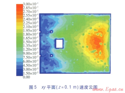 當貼附射流接近地面時,逐漸形成沖擊地板面的沖擊射流[7]。xy平面(z=0.1m)速度云圖見圖5,xy平面(z=0.1m)對稱軸(x軸方向)的流速見圖6。