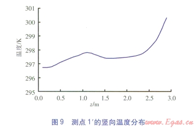 測點6、3、1¢的豎向溫度分布分別見圖7~9。由圖7~9可知,3個測點的溫度沿高度方向(三軸方向)逐漸增大。對于測點6、3,在0.1~1.2m高度范圍內(nèi)溫度緩慢升高,當高于1.2m后溫升速度較快。對于測點l¢,在0.1~2.0m高度范圍內(nèi)溫度緩慢升高,在0.2~1.5m高度范圍內(nèi)溫度出現(xiàn)波動,這一高度區(qū)域恰好與坐姿下的人體腳踝到高于頭頂30cm一段吻合。當高于2.0m后,溫升速度較快。