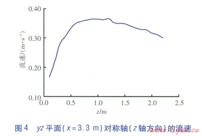 yz平面(x=3.3m)速度云圖見圖3,yz平面(x=3.3m)對稱軸(z軸方向)的流速見圖4。由圖3、4可知,貼附射流的流速沿射程方向呈現(xiàn)先增大后減小的變化趨勢。這種變化是貼附射流在發(fā)展的過程中,受豎向慣性力和豎向浮升力共同作用的結(jié)果。由于送風溫度較低,在出口階段氣流密度較大,氣流豎向慣性力作用比豎向浮升力作用明顯,因此對氣流起著加速作用。隨著貼附射流的發(fā)展,氣流溫度升高,豎向浮升力作用加強以及氣流接近地面時受阻,流速逐漸下降。