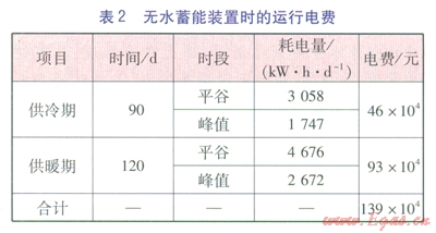 當無水蓄能裝置時,地源熱泵機組只在峰值和平谷時段運行,每天運行時間為11h。按式(1)、(2)計算無水蓄能裝置時的運行電費,結果見表2。
