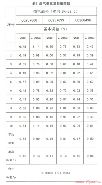 取三臺(tái)B級(jí)BK-G2.5型的皮膜式燃?xì)獗?,選擇Qmax(4.0m3h)0.2Qmax(0.8m3h)兩個(gè)流量點(diǎn)連續(xù)測(cè)量10次得到6組測(cè)量數(shù)據(jù)(見(jiàn)表2),計(jì)算每組測(cè)量列的平均誤差di,然后按照貝賽爾公式可以算出每組測(cè)量列的單次實(shí)驗(yàn)標(biāo)準(zhǔn)差Sj,再推算出6組實(shí)驗(yàn)標(biāo)準(zhǔn)差的合并樣本標(biāo)準(zhǔn)差Sp,則有:u(v1)=Sp