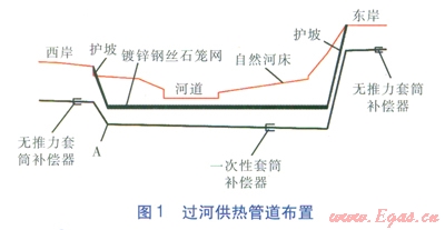 過河供熱管道的布置見圖1。為減少管網(wǎng)中補(bǔ)償器數(shù)量,降低泄漏的危險(xiǎn),該工程選用直埋無補(bǔ)償敷設(shè)。直埋無補(bǔ)償敷設(shè)分為冷安裝、預(yù)應(yīng)力安裝方式,其中預(yù)應(yīng)力安裝方式可分為預(yù)熱安裝、一次性補(bǔ)償器安裝方式[1-2]。對(duì)于分支較少,地下障礙較少,地勢平坦,地質(zhì)條件較好的熱水供熱系統(tǒng),推薦采用冷安裝方式。而該工程地形復(fù)雜,起伏大,地質(zhì)條件不佳,加之管徑較大,易出現(xiàn)局部失穩(wěn)。若采用冷安裝方式,難度大、成本高,因此我們決定采用預(yù)熱安裝方式。在管道中設(shè)置一次性補(bǔ)償器,管道焊接后,除一次性補(bǔ)償器附近管溝外,其他管溝立即回填。在首次加熱過程中,當(dāng)一次性補(bǔ)償器的補(bǔ)償量達(dá)到補(bǔ)償管段所要提前釋放的熱膨脹量時(shí),把一次性補(bǔ)償器焊死,完成管道的整體焊接。