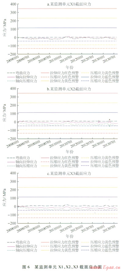 從系統(tǒng)監(jiān)測(cè)成果看,自200812月至今,應(yīng)變監(jiān)測(cè)Xl、X3截面軸向附加應(yīng)力未達(dá)到過(guò)預(yù)警閾值;應(yīng)變監(jiān)測(cè)X2截面在201341 5日因軸向附加壓應(yīng)力超過(guò)容許附加應(yīng)力的30%,曾出現(xiàn)過(guò)l次藍(lán)色預(yù)警。管道軸向附加應(yīng)力總體在溫差和輸送內(nèi)壓作用的合理范圍內(nèi)波動(dòng)。相關(guān)管道管理部門(mén)根據(jù)系統(tǒng)監(jiān)測(cè)成果,及時(shí)掌握了穿越活動(dòng)斷裂帶管道的力學(xué)狀態(tài)。
