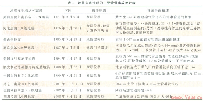 雖然在管道設(shè)計(jì)和施工階段,已經(jīng)充分考慮了地震斷裂帶對(duì)管道可能產(chǎn)生的影響和危害,并采取了相應(yīng)措施,如避讓、淺埋、架空、合適角度穿越、寬溝、松散砂土換填等,盡可能降低了風(fēng)險(xiǎn)和危害,但地震對(duì)管道的影響無(wú)法完全規(guī)避。據(jù)文獻(xiàn)資料記載,歷史上曾經(jīng)發(fā)生過(guò)許多地震斷裂帶損壞管道的事件,表1列出了白1971年美國(guó)圣費(fèi)爾南多谷發(fā)生地震至今地震災(zāi)害造成的主要管道事故[10]。