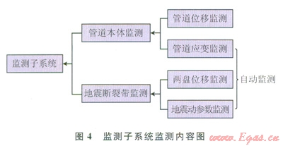 穿越地震斷裂帶的管道安全監(jiān)測(cè)預(yù)警系統(tǒng)的設(shè)計(jì)理念是兼顧災(zāi)害的主、客體,分別對(duì)致災(zāi)體和承災(zāi)體開(kāi)展行之有效的監(jiān)測(cè)。系統(tǒng)利用先進(jìn)的傳感元件和數(shù)據(jù)采集設(shè)備,全天候、不間斷地監(jiān)測(cè)管道工作狀態(tài),在計(jì)算機(jī)硬件和軟件系統(tǒng)的支持和控制下,通過(guò)對(duì)測(cè)量和采集的數(shù)據(jù)進(jìn)行處理和分析,自動(dòng)評(píng)價(jià)管線的局部安全狀態(tài),并將監(jiān)測(cè)和分析結(jié)果自動(dòng)地存入計(jì)算機(jī)作為管線運(yùn)行的歷史檔案。