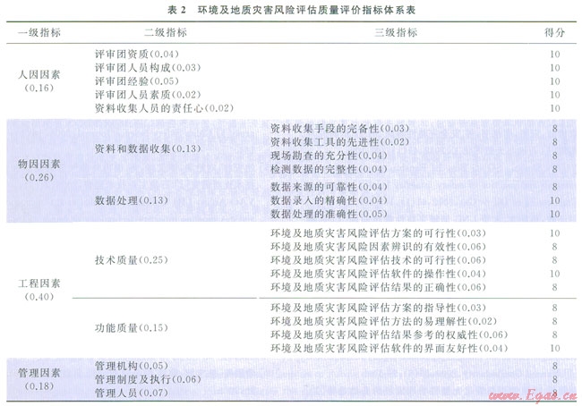 專家組根據(jù)環(huán)境及地質災害專項風險評價的特點,在圖2所示質量評價體系結構的基礎上制訂出一套有針對性的質量評價指標體系(表2),其中括號內為各指標權重值。