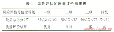 依據(jù)對評價結果的量化程度,將風險評估質量評價方法大致分成定性和定量兩大類。定性方法主要有專家評分法、風險矩陣法、檢查表法和影響圖法等;定量方法主要有風險函數(shù)法、關聯(lián)度函數(shù)法和指標體系等。由于指標體系法其評價方法簡單、易于操作,故筆者采用指標體系法來進行質量評價。