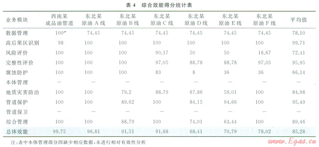 1)本次評(píng)價(jià)中,各評(píng)價(jià)單元總體效能平均值為85.28分,效能評(píng)級(jí)為較高,即各條管線的各項(xiàng)業(yè)務(wù)模塊都基本能夠達(dá)到工作的預(yù)期目標(biāo)。