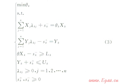 通過(guò)式(3)求解,可以得到在有邊界約束條件下第k個(gè)決策單元的綜合效率評(píng)價(jià)指數(shù)(即相對(duì)有效性值)qk以及參數(shù)lk和各松弛變量s`k,sk+的最優(yōu)解qk*、lk*、s`k*sk+*。