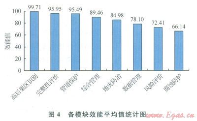 本次評(píng)價(jià)針對(duì)各模塊都進(jìn)行了評(píng)價(jià),統(tǒng)計(jì)結(jié)果見(jiàn)表4。對(duì)7條線路管道完整性管理總體效能評(píng)價(jià)的結(jié)果見(jiàn)圖37條線路各業(yè)務(wù)模塊效能平均值統(tǒng)計(jì)如圖4所示。