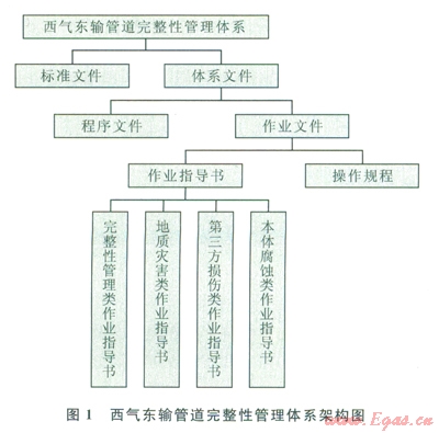 西氣東輸管道完整性管理體系是西氣東輸HSE管理體系的分支,包括標準體系和體系文件兩部分,其中體系文件又包括程序文件和作業(yè)文件兩部分,具體架構(gòu)如圖l所示。目前,西氣東輸管道公司管道完整性管理體系包含1 2個標準文件,4個程序文件和41個作業(yè)文件[12-14]。