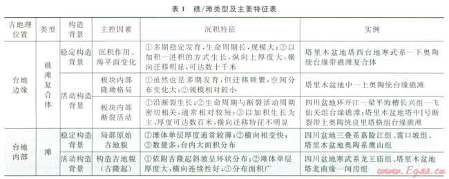 根據(jù)礁、灘所處的古地理位置,可以分為臺(tái)緣礁/灘和臺(tái)內(nèi)礁/灘,它們?cè)诎l(fā)育位置、規(guī)模、形態(tài)和空間分布等方面有很大不同。塔里木盆地、四川盆地臺(tái)緣礁灘和臺(tái)內(nèi)灘均有大面積分布,是油氣勘探尋找的有利相帶,因此筆者將重點(diǎn)討論臺(tái)緣礁灘和臺(tái)內(nèi)灘在不同構(gòu)造背景下的發(fā)育特征。