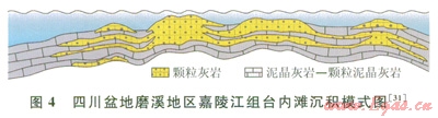 以四川盆地下三疊統(tǒng)嘉陵江組為例,顆粒灘在臺(tái)地內(nèi)部十分發(fā)育,其分布主要受臺(tái)內(nèi)原始古地貌和海平面變化控制[32]。盆地內(nèi)不同地區(qū)臺(tái)內(nèi)灘發(fā)育特征有差異,但總體上具有以下特點(diǎn):顆粒含量高,以砂屑和鮞粒為主;交錯(cuò)層理普遍發(fā)育;垂向上形成向上變淺的沉積序列;海侵期顆粒灘發(fā)育時(shí)間短,規(guī)模相對(duì)較小,灘體厚度多為l~3m;高位域顆粒灘規(guī)模較大,厚度介于1~8m。