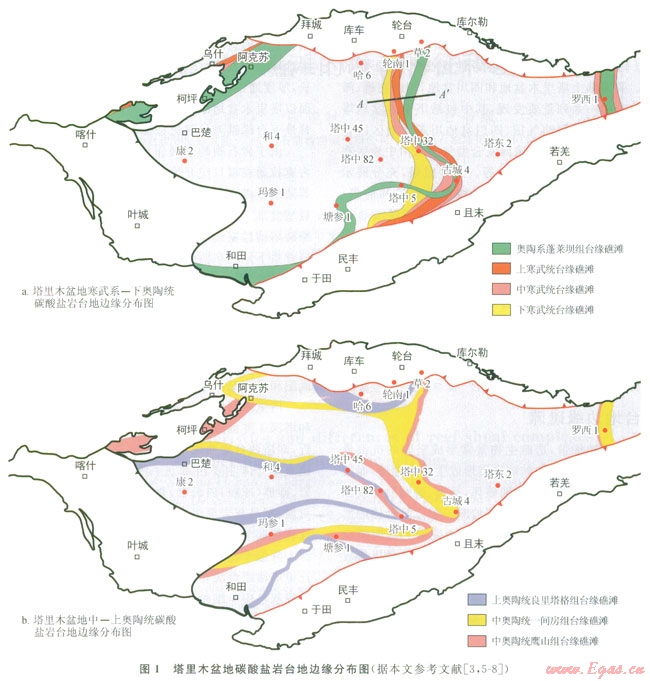 穩(wěn)定構(gòu)造背景和活動(dòng)構(gòu)造背景下形成的臺(tái)緣礁灘都有規(guī)模發(fā)育的地質(zhì)基礎(chǔ),是優(yōu)質(zhì)儲(chǔ)層發(fā)育相帶。首先,穩(wěn)定構(gòu)造背景下發(fā)育的臺(tái)緣礁灘叮形成多個(gè)旋回或條帶,規(guī)模可以很大。以塔罩木盆地為例,寒武紀(jì)一早奧陶世發(fā)育2個(gè)旋回、5條臺(tái)緣帶,多期臺(tái)緣帶疊合面積達(dá)2.6×104km2(圖1、2)。同沉積斷層的持續(xù)活動(dòng),為臺(tái)緣礁灘體穩(wěn)定生長創(chuàng)造了前提條件,雖然平面分布范圍有限,但是厚度町以很大。例如四川盆地環(huán)開江—梁平“海槽”,臺(tái)緣礁/灘體長850km,寬2~4km,厚300~500m,總面積近2×104km2[28];塔里木盆地塔中地區(qū)良里塔格組臺(tái)緣礁灘東西長達(dá)220km最厚超過300m[29]。