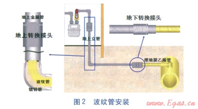 波紋管安裝方法簡單(見圖2),先在庭院靠近樓房的位置開挖一小坑,外露埋地的引入鍍鋅鋼管,將鍍鋅鋼管隔離。然后在地上引入管距地面約lm處拆開接口或引入管閥門,利用專用工具設(shè)備及按照廠家提供的操作指引,將波紋管從地上引入管開口一端推進鍍鋅鋼管內(nèi),直至波紋管從鍍鋅鋼管另一端埋地開口導(dǎo)出。再利用特制的轉(zhuǎn)換接頭把兩端凸出的波紋管分別連接至地上金屬管和埋地聚乙烯管道,隨即進行壓力試驗。最后,向轉(zhuǎn)換接頭上附設(shè)的灌漿孔中注入水泥漿,填充波紋管與鍍鋅鋼管內(nèi)壁之間的空隙,至此修復(fù)工作完成。內(nèi)襯的波紋管受原來的鍍鋅鋼管保護,在一定程度上可降低外力影響。室內(nèi)安裝方法與此類似。