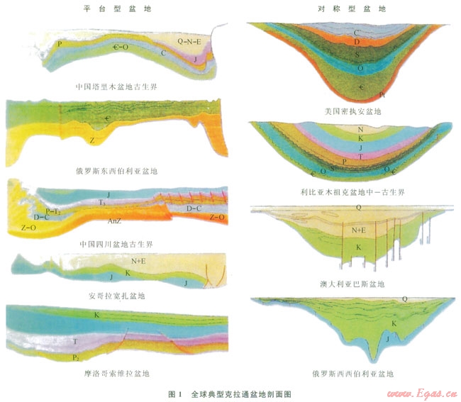 克拉通盆地的概念:有廣泛沉積、般規(guī)模較大,以淺海相沉積為主,構(gòu)造活動(dòng)相對(duì)穩(wěn)定,巖漿活動(dòng)較弱,多呈碟狀、大而平緩的沉積盆地。該類盆地主要發(fā)育在古生代及中生代早期。全球克拉通盆地分布廣泛,在各大地塊均有。如中國(guó)塔里木、四川、鄂爾多斯盆地,俄羅斯西伯利亞盆地,美國(guó)密執(zhí)安、二疊盆地,中東波斯灣盆地,非洲利比亞木祖克盆地等(1)[1-2]。