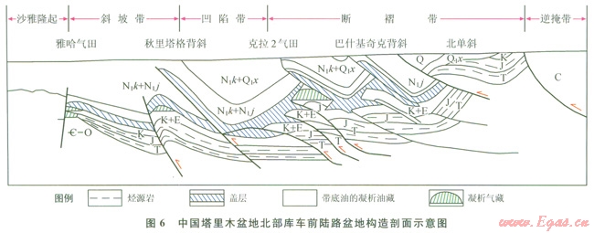 3)凹陷帶:鄰近斷褶帶內(nèi)側(cè)往往形成凹陷帶,是中新生代沉積厚度最大、下凹最深的部位。如烏魯木齊前陸盆地的昌吉凹陷、庫車前陸盆地和拜城—陽霞凹陷、葉城前陸盆地的皮山凹陷等。