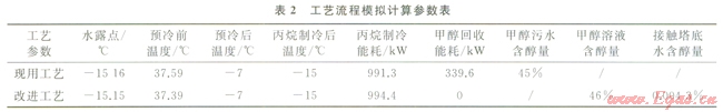 現(xiàn)用注醇工藝流程模擬與改進(jìn)后注醇工藝流程模擬原料氣的溫度、壓力、流量以及原料氣組成完全相同,而且保持板翅換熱器與丙烷蒸發(fā)器的溫降也相同。與此同時(shí),現(xiàn)用注醇工藝與改進(jìn)后注醇工藝外輸干氣的露點(diǎn)分別為-l5.16℃和-15.15℃,幾乎相同,在保證沒有天然氣水合物形成、取最小注醇量的基礎(chǔ)上對(duì)兩種工藝進(jìn)行對(duì)比分析,工藝參數(shù)對(duì)比見表2。