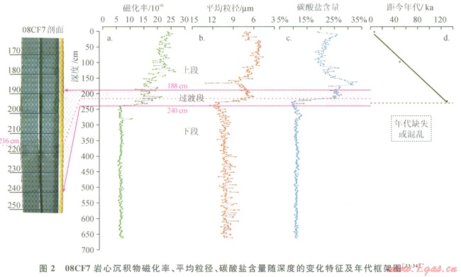 08CF7巖心在琴叁和取樣過(guò)程中未遭到人為破壞,且未見(jiàn)明顯生物擾動(dòng)痕跡,因此能較好地指示其原位沉積特征。巖心觀察發(fā)現(xiàn),沉積物白頂向下以216cm處為界,上部為灰黑色,下部為淺黑色,交界面呈相互穿透狀,整段巖心的沉積物類型均為黏土質(zhì)粉砂。筆者在前期的研究中已對(duì)巖心沉積物進(jìn)行粒度、磁化率和碳酸鹽含量測(cè)定和分析[34-35],將結(jié)果進(jìn)行綜合對(duì)比和分析,發(fā)現(xiàn)這3項(xiàng)指標(biāo)均呈現(xiàn)出相似的變化趨勢(shì),可分為3段:①0188cm段,各項(xiàng)指標(biāo)變化較大,以磁化率值高,沉積物粒度小及碳酸鹽含量高為特征;②188240cm段,為各項(xiàng)指標(biāo)和沉積物巖性變化的過(guò)渡段;③240cm以下,各項(xiàng)指標(biāo)呈現(xiàn)均一性變化,相對(duì)以磁化率值低,沉積物較粗及碳酸鹽含量低為特征(2)。