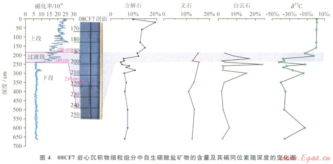 對(duì)沉積物結(jié)構(gòu)構(gòu)造、粒度、磁化率、碳酸鹽含量(2)以及細(xì)粒組分中自生碳酸鹽礦物的含量及碳同位素(4)的研究表明,08CF7巖心可分為3段:上段(0188cm)、過(guò)渡段(188240cm);下段(240cm以下)。上下段沉積物的各個(gè)沉積特征均存在明顯差異,且成巖環(huán)境也截然不同。Wang[35]朝建立了巖心上段地層的年代框架,認(rèn)為巖心224cm以上代表正常沉積地層,但224cm以下則出現(xiàn)沉積物地層框架混亂的情況。綜合分析認(rèn)為,巖心下段的沉積物整體物質(zhì)組分比較單一,各項(xiàng)反映沉積特征的指標(biāo)呈均一性變化,說(shuō)明該部分沉積可能不是海洋深水環(huán)境的正常沉積,而是某一特殊事件造成的沉積段,其成因可能與08CF7巖心所處的特殊沉積環(huán)境和沉積過(guò)程有關(guān)。