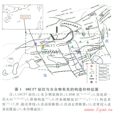 08CF7站位位于南海北部神狐海區(qū)。該海區(qū)位于南海北部陸坡中段,界于兩沙海槽和東沙群島之間,構(gòu)造上處于珠江口盆地珠Ⅱ凹陷,自中新世以來(lái)進(jìn)入構(gòu)造沉降[30]。新生代沉積厚度介于10007000m,有機(jī)質(zhì)含量為0.2%~l.9[5,29]。水深8002000m,海底地形復(fù)雜且坡度變化較大。高分辨率地球物理調(diào)查表明,該海域廣泛發(fā)育斷裂一褶皺體系、泥火山、泥底辟等構(gòu)造,且海底以下150350m廣泛分布BSR,具有較好的水合物形成和賦存的地質(zhì)條件 [5,1821],且于2007年在該海區(qū)成功鉆取到水合物實(shí)物樣品[31]。