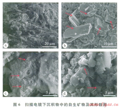 自生碳酸鹽礦物主要呈細(xì)粒狀發(fā)育在沉積物中,在掃描電子顯微鏡下,原樣中的文石呈針狀生長(zhǎng)在沉積物中(6-a),沒(méi)有發(fā)現(xiàn)沿孔隙生長(zhǎng)的簇狀文石,而在細(xì)粒組分中,文石呈碎屑狀出現(xiàn)(6-b)。白云石呈微晶狀發(fā)育在黏土團(tuán)塊中(6-c),周圍有l0mm的滲漏微孔。在原樣中沒(méi)有觀察到方解石顆粒,但在細(xì)粒組分中可觀察到方解石呈棱形體零星地散布在細(xì)粒組分中(6-d),顆粒一般為215mm。這些觀察表明,沉積物中發(fā)育自生碳酸鹽礦物,但其顆粒細(xì)小且分散在沉積物中,未發(fā)育成塊狀碳酸鹽巖。