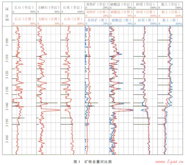 圖1中藍(lán)色曲線是斯倫貝謝利用Spectrolith模型計(jì)算得到的礦物含量,該模型通過(guò)Si、Ca、Fe 3種元素取代Al元素來(lái)做精確的黏七估算,而不再需要測(cè)量Al的含量。即