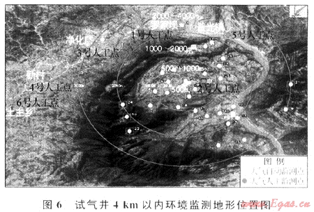 環(huán)境監(jiān)測(cè)工作分為試氣前背景調(diào)查、試氣期間實(shí)時(shí)監(jiān)測(cè)及試氣后污染調(diào)查3個(gè)階段。在周?chē)h(huán)境4km范圍開(kāi)展了大氣、水質(zhì)、土壤、生態(tài)等方面的環(huán)境監(jiān)測(cè)及調(diào)查,共布設(shè)大氣自動(dòng)監(jiān)測(cè)點(diǎn)位32個(gè)、大氣人工監(jiān)測(cè)點(diǎn)位6個(gè),監(jiān)測(cè)大氣中二氧化硫和硫化氫濃度;設(shè)地表水監(jiān)測(cè)斷面3個(gè),降雨監(jiān)測(cè)點(diǎn)位16個(gè),井場(chǎng)周?chē)烊怀靥?個(gè),監(jiān)測(cè)其pH值、化學(xué)需氧量、油分、硫化物等含量;設(shè)土壤監(jiān)測(cè)點(diǎn)位4個(gè)。為保證監(jiān)測(cè)全面性,還進(jìn)行了井場(chǎng)周?chē)鷳B(tài)調(diào)查和降水中硫酸鹽等指標(biāo)的測(cè)定。共獲得數(shù)據(jù)1521184個(gè),工作量匯總見(jiàn)表1,環(huán)境監(jiān)測(cè)地形位置見(jiàn)圖6,試氣過(guò)程環(huán)境監(jiān)測(cè)對(duì)照見(jiàn)表2。