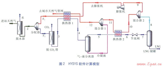 通往膨脹機(jī)的膨脹氣流F1經(jīng)過換熱器l后溫度降低,然后進(jìn)入膨脹機(jī)膨脹降溫降壓,與LNG儲(chǔ)罐排出的低溫天然氣匯合后通過換熱器2,然后與氣一液分離器分離出的冷凝液混合后通過換熱器1,為液化氣流F2提供冷量后溫度升到常溫,進(jìn)入城市管網(wǎng)(圖1中紅色線條部分)。