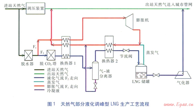 液化回路的天然氣凈化后先通過換熱器1溫度降低,經(jīng)氣一液分離器分離出冷凝液后進(jìn)入換熱器2,高壓天然氣冷凝液化,然后通過節(jié)流閥節(jié)流降溫降壓,再進(jìn)入LNG儲(chǔ)罐,未液化氣體及蒸發(fā)氣與膨脹機(jī)膨脹后的天然氣匯合,進(jìn)入換熱器2。生產(chǎn)的液化天然氣在用氣高峰時(shí)氣化調(diào)壓送入城市管網(wǎng),起到調(diào)峰作用(圖1中藍(lán)色線條部分)。
